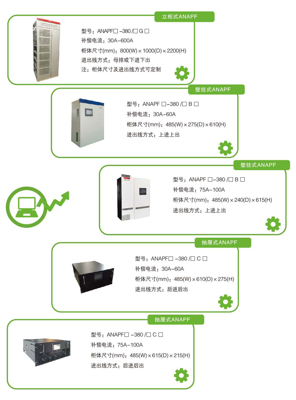 ANAPF系列有源電力濾波器通過電流互感器采集系統諧波電流,經控制器快速計算并提取各次諧波電流的含量,產生諧波電流指令,通過功率執行器件產生與諧波電流幅值相等方向相反的補償電流,并注入電力系統中,從而抵消非線性負載所產生的諧波電流。
