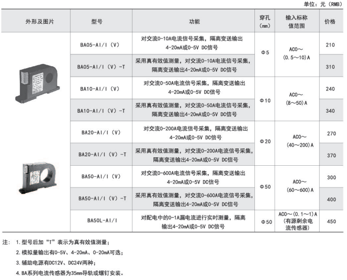 | BA50-AI/I(V) | 對交流0-600A電流信號采集,隔離變送輸出4-20mA或0-5V DC信號 | Φ50 | AC0~(60~600)A |