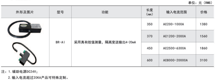 | BR-AI | 采用真有效值測(cè)量, 隔離變送輸出4-20mA | 350 | AC200-1000A |