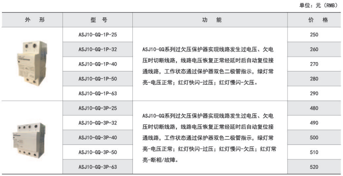 ASJ10-GQ系列自復式過欠壓保護器(以下簡稱ASJ),適用于單相交流電壓230V或三相電壓400V,頻率50Hz,額定工作電流至63A及以下的用戶或負載。由中性線故障引起的單相或三相線路過、欠電壓時,保護器對用電設備進行保護。