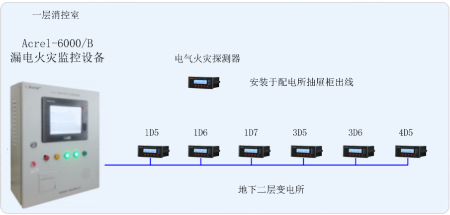 交通飯店有一個(gè)變電所,位于地下二層。變電所負(fù)責(zé)負(fù)一層超市以及地上樓層部分的用電。現(xiàn)為本項(xiàng)目設(shè)計(jì)一套漏電火災(zāi)系統(tǒng),由此來(lái)實(shí)時(shí)監(jiān)測(cè)變電所內(nèi)重要回路的漏電流,以確保變電所配電系統(tǒng)的電氣安全。