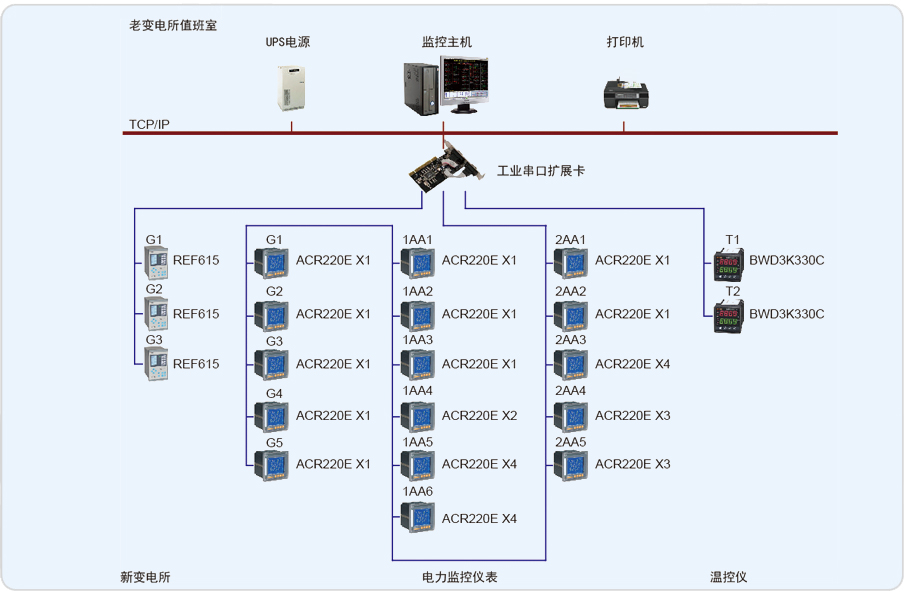 安科瑞電氣股份有限公司于2011年8月承接了蘇州軸承廠有限公司電力監(jiān)控系統(tǒng)的設(shè)計(jì)與實(shí)施。本監(jiān)控系統(tǒng)主要實(shí)現(xiàn)蘇州軸承廠有限公司的10/0.4kV配電系統(tǒng)進(jìn)行用電監(jiān)測(cè)與電能管理;監(jiān)測(cè)范圍為新建變電所的T1、T2變壓器進(jìn)線柜,聯(lián)絡(luò)柜,溫控儀,高壓側(cè)儀表及綜保進(jìn)行遠(yuǎn)程實(shí)時(shí)監(jiān)控和電能管理。該系統(tǒng)總計(jì)有31只儀表(其中包括26只ACR220E,3只ABB,2只溫控儀),分3條總線,都是直接通過屏蔽雙絞線走管道拉至值班室連接到主機(jī)擴(kuò)展卡上,實(shí)現(xiàn)總線上儀表與監(jiān)控主機(jī)的數(shù)據(jù)連通。