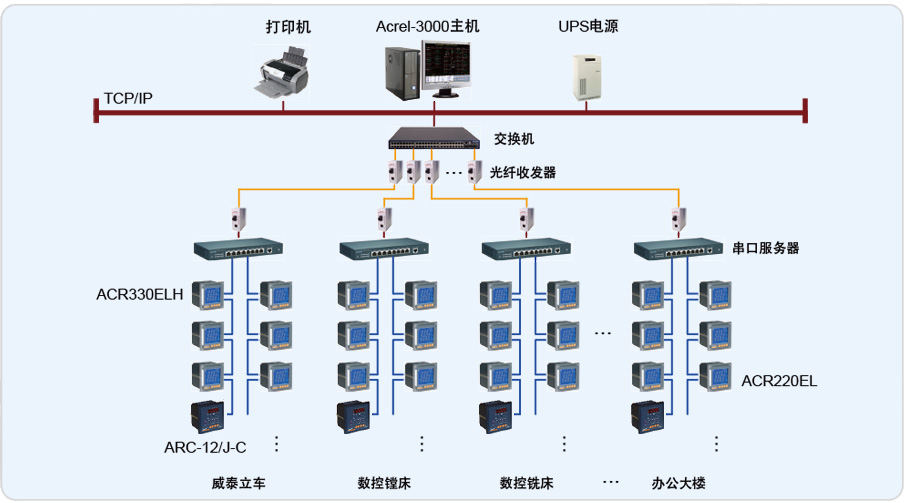 整個系統(tǒng)采用Acrel-3000型電能管理系統(tǒng),完成了對威泰立車公司、數(shù)控鏜床公司、數(shù)控銑床公司、武漢善福公司、武重鑄鍛公司、大件加工廠、中小件加工廠、辦公大樓8個單位13個配電室各回路的電能監(jiān)測和管理。其中低壓進(jìn)線回路裝安科瑞ACR330ELH,低壓功率因數(shù)補(bǔ)償回路ARC-12/J-C型功率因數(shù)自動補(bǔ)償控制儀,其它回路配置ACR220EL網(wǎng)絡(luò)電力儀表。整個系統(tǒng)采用網(wǎng)絡(luò)分布式結(jié)構(gòu),監(jiān)控主機(jī)位于10KV監(jiān)控室內(nèi),系統(tǒng)采用開放的通訊協(xié)議,通過現(xiàn)場總線連接到通訊服務(wù)器 NPort5430 。13個配電室通過光纖組網(wǎng)與低壓配電系統(tǒng)相連,實現(xiàn)數(shù)據(jù)通訊功能。