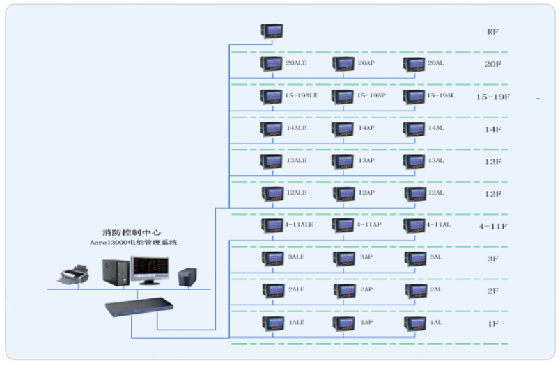我司本項(xiàng)目承接其樓層部分電能管理系統(tǒng)搭建,完成對(duì)配電回路用電的實(shí)時(shí)監(jiān)控和管理。該項(xiàng)目進(jìn)出線(xiàn)回路均采用ACR多功能液晶顯示儀表,其是針對(duì)電力系統(tǒng)、公共設(shè)施、智能大廈的電力監(jiān)控需求而設(shè)計(jì)的網(wǎng)絡(luò)電力儀表,它能測(cè)量所有常規(guī)電力參數(shù),如:三相電壓、電流、有功功率、無(wú)功功率、功率因數(shù)、頻率、有功電度、無(wú)功電度。現(xiàn)場(chǎng)儀表以手拉手方式通過(guò)屏蔽雙絞線(xiàn)(RVVSP2*1.0)進(jìn)行通訊連接,每根總線(xiàn)連接智能儀表數(shù)量在20只左右,不同種類(lèi)的智能裝置連接在不同的總線(xiàn)上,然后將數(shù)據(jù)上傳至數(shù)據(jù)采集器,進(jìn)而將數(shù)據(jù)上傳至當(dāng)?shù)乇O(jiān)控終端。