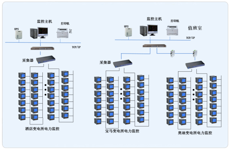 本項(xiàng)目根據(jù)管理區(qū)域設(shè)置兩套Acrel-2000型電力監(jiān)控系統(tǒng),系統(tǒng)采用網(wǎng)絡(luò)分布式結(jié)構(gòu),其中寶馬奧迪主機(jī)設(shè)置在地下配電值班室,酒店設(shè)置在一樓值班室。所有配電回路均配備安科瑞電力儀表PZ系列。該項(xiàng)目實(shí)現(xiàn)了3個(gè)變電所內(nèi)電力系統(tǒng)的智能管理。所有監(jiān)控設(shè)備均通過屏蔽雙絞線至各自配電室內(nèi)的通訊管理機(jī),從而實(shí)現(xiàn)遠(yuǎn)程監(jiān)控。