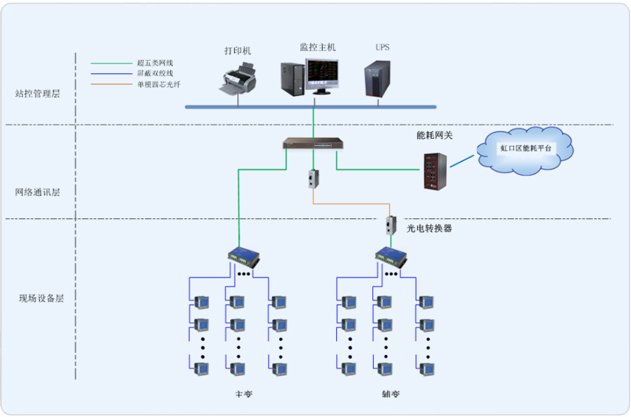 根據(jù)上海虹口區(qū)的相關(guān)能耗導(dǎo)則,現(xiàn)針對虹口區(qū)的兩個變電所實現(xiàn)能耗的實時監(jiān)控,并按照區(qū)域能耗平臺的數(shù)據(jù)要求,將虹口足球場的用能分為空調(diào)用電、照明插座用電、動力用電以及特殊用電,將以上數(shù)據(jù)不間斷上傳至虹口區(qū)能耗平臺。