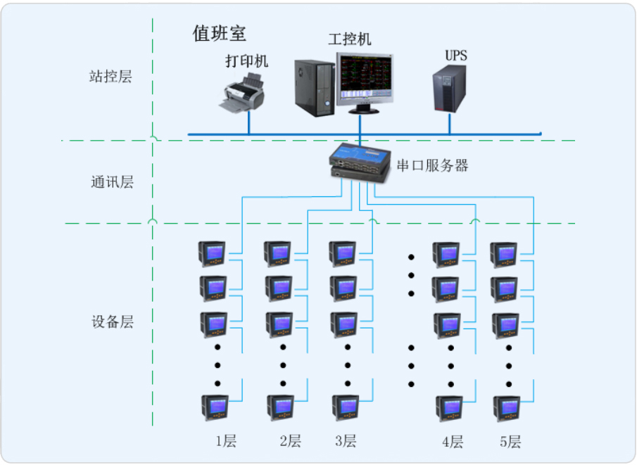 本項(xiàng)目是為羅店鎮(zhèn)市民服務(wù)中心樓層配電部分設(shè)計(jì)的電能管理系統(tǒng),監(jiān)控范圍為8層樓內(nèi)的多功能儀表。現(xiàn)場(chǎng)多功能儀表通過(guò)總線接入值班室采集器,再將通過(guò)采集器連接到監(jiān)控主機(jī),從而在監(jiān)控主機(jī)上實(shí)現(xiàn)總線上儀表與監(jiān)控主機(jī)的數(shù)據(jù)連通。通過(guò)Acrel-3000電能管理系統(tǒng)對(duì)樓層用電環(huán)節(jié)進(jìn)行記錄與統(tǒng)計(jì),借助計(jì)算機(jī)輔助手段進(jìn)行集抄,節(jié)省人工成本。