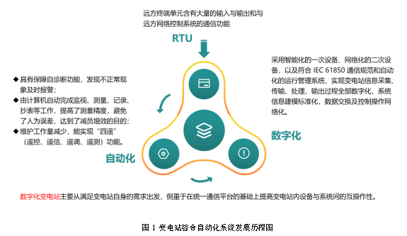 變電站綜合自動化系統是指完成以下基本功能: l 從當地和遠方獲取電力系統信息; l 支持當地手動和自動功能; l 在變電站自動化系統和電網管理系統之間,提供與開關設備的通信連接和接口。 這些功能可以由大量裝用的智能電子設備(IED)不同程度的組合來實現。 變電站綜合自動化系統的發展主要經歷了三個階段; 1)歷史上,開關設備和網絡管理系統的接口是在各變電站的遠方終端單元(RTU)。RTU是一個集中單元,含有大量的輸入與輸出,基本沒有當地功能,但是具有與遠方網絡控制系統的通信功能。結構上僅是站級概念,現場有關重要信息(如保護動作信息等)通過硬接點送給RTU裝置,變電站的監測量一般經變送器變換后送給RTU,開關量監測是直接引至RTU,RTU的控制輸出一般經遙控執行柜發出控制命令。整體系統功能不強、硬件設備重復、整體性能指標低、適合于老系統改造。 2)相比與RTU,變電站自動化系統以不同程度的分散結構實現上述基本功能,通過這些功能可對變電站進行管理,實現從線路隔離與接地到收集狀態監測數據等所有自動化功能。RTU的通信功能在變電站自動化發展中變為通信接口,由通信網關執行,根據所用的通信協議,網關將規約雙向轉換(即規約轉換器),在變電站自動化分布式智能電子設備中存儲的信息通過網關傳送給SCADA主站與遠方調度電網管理系統。 3)隨著信息技術已經進步到可以實現廣域保護,依靠協調防御計劃來保護整個電力系統,以及IEC61850作為《變電站通信網絡和系統》的新國際標準,數字化變電站將以三層兩網式部署,三層分別是指站控層設備、間隔層設備和過程層設備,兩網分別是指站控層網絡和過程層網絡。間隔層包括數字式保護、計量、監控等二次設備,負責間隔內信息的運算處理與控制,以及與過程層和站控層之間的網絡通信工作;過程層主要包括電子式互感器、合并單元、智能斷路器、智能開關、智能終端,該層主要實現信號的采集和對系統的操作控制。三層設備之間通過分層、分布、開放式的兩層網絡實現連接,兩層網絡物理上相互獨立,站控層網絡構建為全站統一的MMS網,過程層網絡則包括GOOSE網和SV網。但數字化變電站設置了大量的智能終端、交換機等過程層設備,使得整體動作延時增加、網絡復雜。 圖1 變電站綜合自動化系統發展歷程圖
