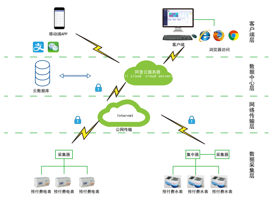 對于分布不同省、地市或同地市不同區域的連鎖商業、集團、百貨、門店、物業、院校等業務分散,要求集中管理、線上支付,低額提醒、欠費告警。但常規的本地插卡付費、本地預付費并不能完全滿足客戶管理需求,預付費云平臺應運而生。AcrelCloud-3200水電預付費云平臺無縫集成商業、物業公司、集團企業、院校等分散布置的安科瑞DDSY/ADF系列電子式預付費電能表、閥控智能水表等,提供微信、支付寶、銀聯等可選的在線支付方式,大大方便了用戶充值、圈存,提供預警和充值、退費、電能消耗等記錄查詢,方便用戶和管理方的數據統計和財務分析,提供先交費后使用的管控機制,大大降低了管理部門的收費成本。應用場所: